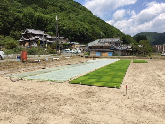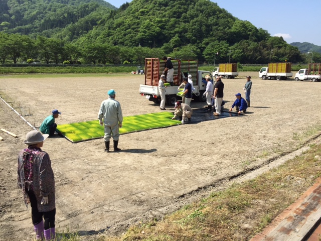 タイトル通り、苗の第1弾が到着しました。めっちゃ大人数で運んでこられたので、苗下ろしはおまかせして私はマルチを引くのに専念してました。